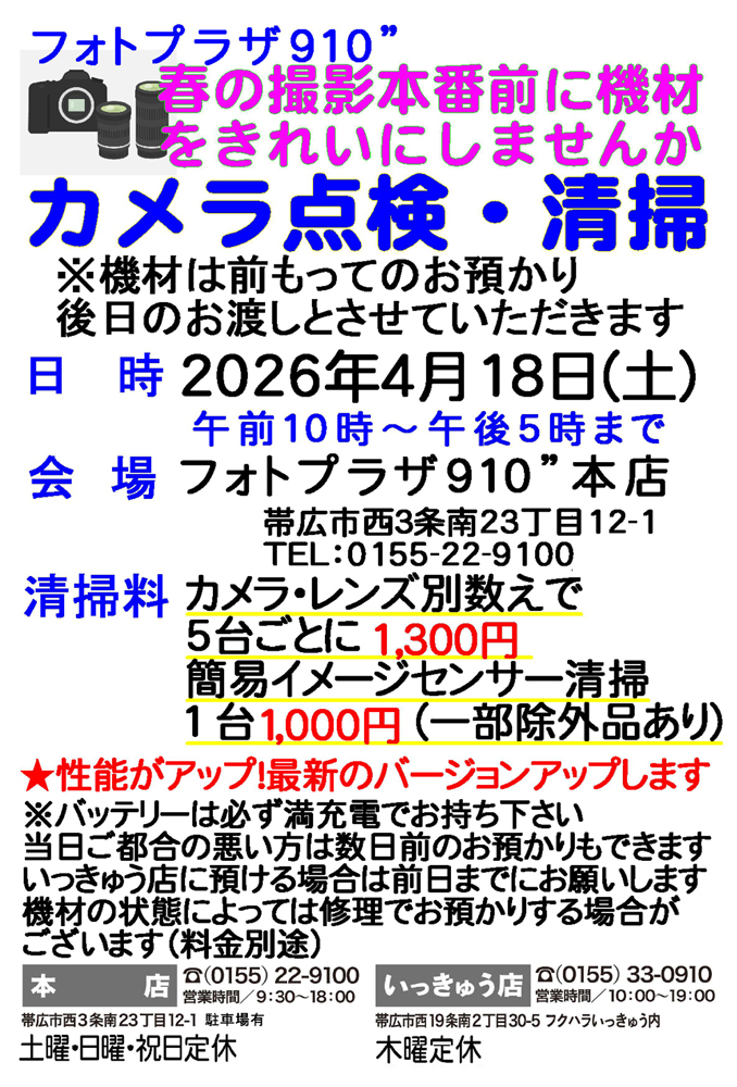 カメラの点検・清掃会のご案内です 投稿日 2026年3月28日 著者 有限会社フォトプラザクドウ カテゴリー お知らせ 春の撮影や行楽で忙しくなる前に機材を全部きれいにしておきましょう!カメラの機能や不具合も直すバージョンアップもしますよ(一部除外品あり)